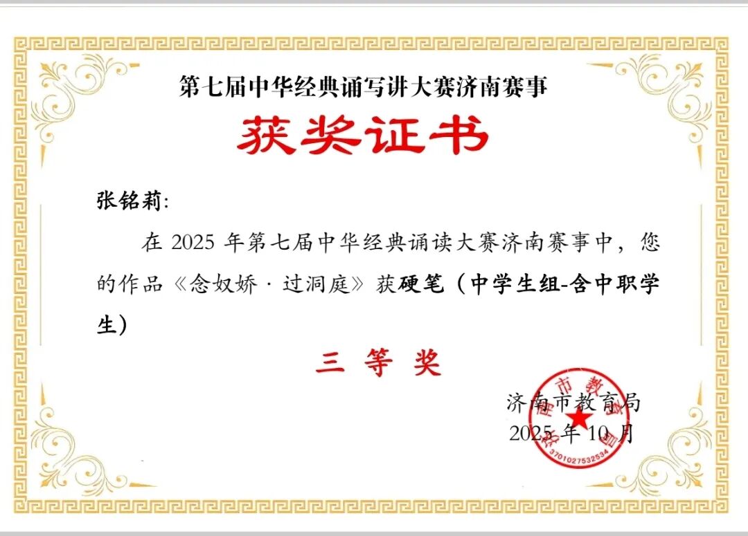 近日,2025年第七届中华经典诵读大赛济南赛事结果公布,伯阳学子凭借扎实的文化素养、出色的舞台表现,在激烈角逐中脱颖而出,斩获奖项,为学校赢得荣誉!